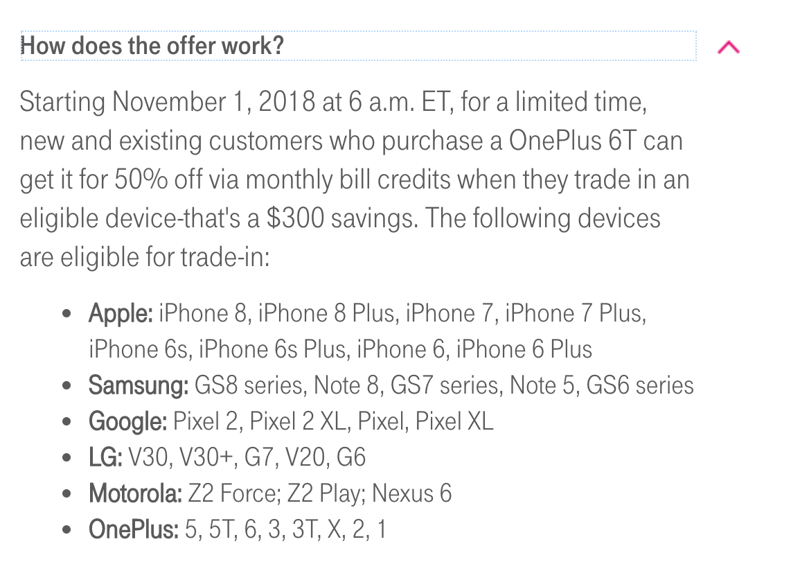 Sort of. There's a significant list of smartphones users can trade in for approximately $300 in credit toward a OnePlus 6T. That list includes basically every recent iPhone and major Samsung phone, as well as a few big name phones from other manufacturers. Otherwise the price of the OnePlus 6T is the same at T-Mobile USA as it is online from OnePlus.