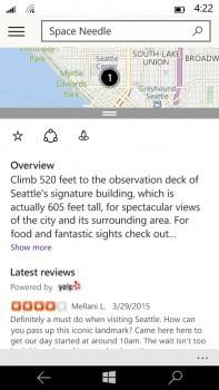 Search comes on the back of Bing, which brings up a host of popular search topics like restaurants and hotels. If you search for a business, landmark, or other location, Bing will feed you details about the area or place of interest as well as reviews.