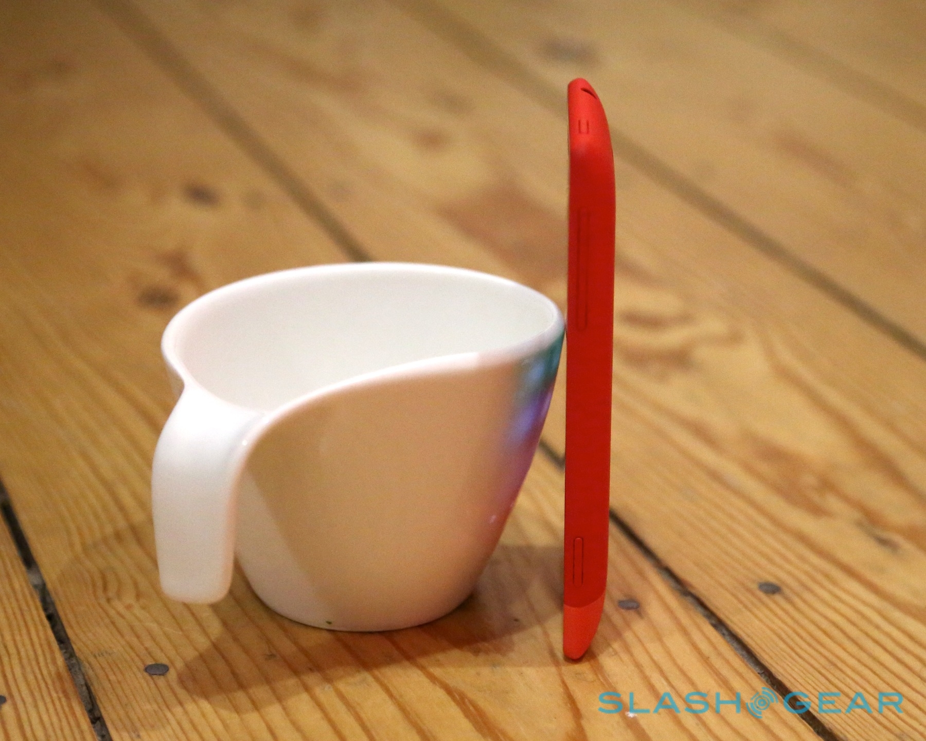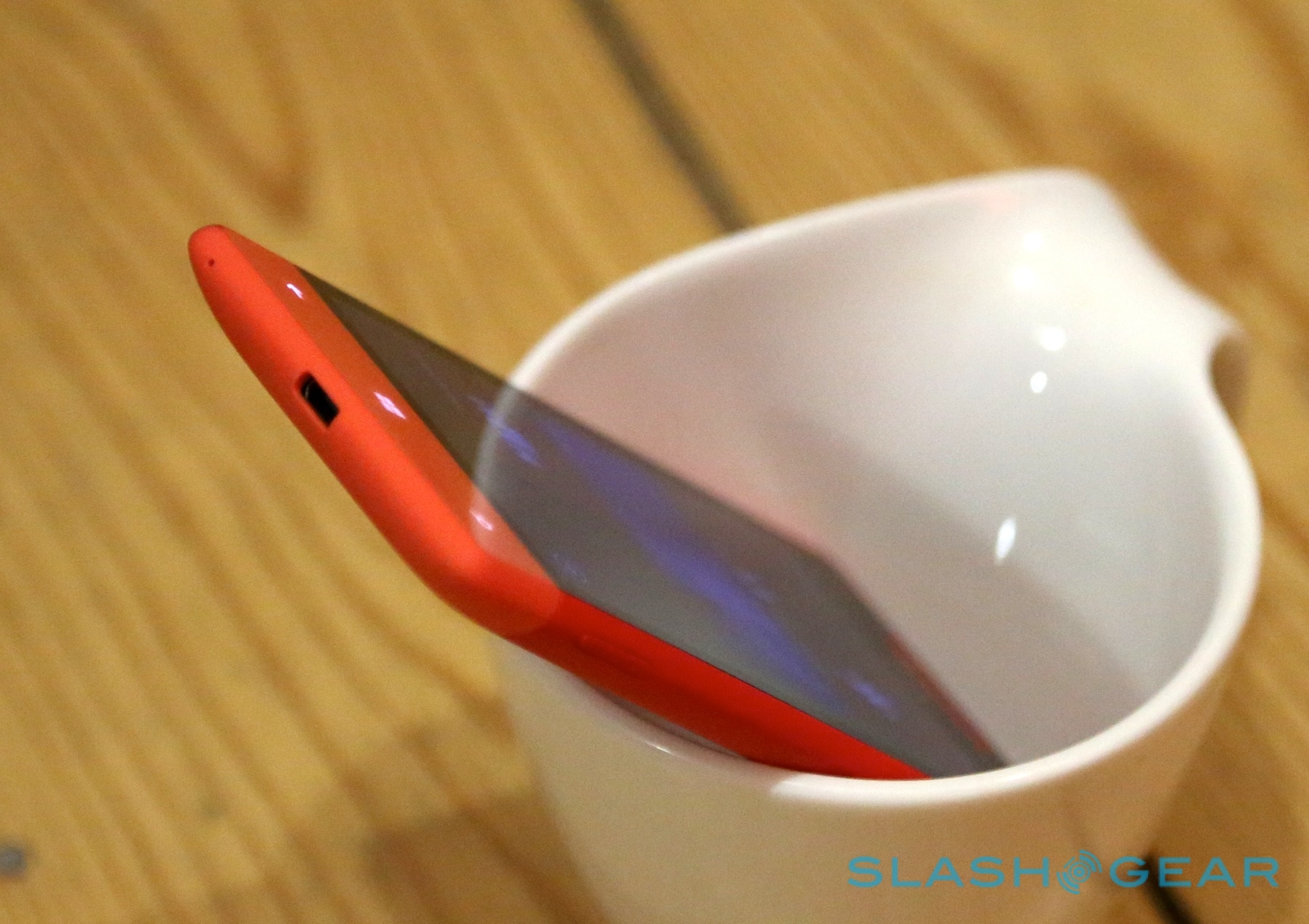 Buttons are the Microsoft-mandated usual, with touch-sensitive keys for back, Start, and search under the screen, a power key on the top edge, and finally a volume rocker and camera button on the right edge. The headphone jack sits on the top edge, while the microUSB port is on the bottom; that whole section unclips (with no small amount of difficulty) to reveal a microSD slot and micro SIM slot.