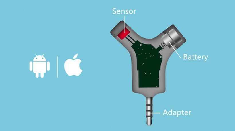 The Wishbone device connects to a smartphone and works in conjunction with an app. It plugs directly into the headphone jack on Android and iPhone devices. Wishbone is powered by small lithium batteries that sit inside the device, opposite the sensor.