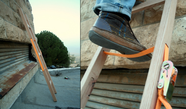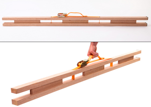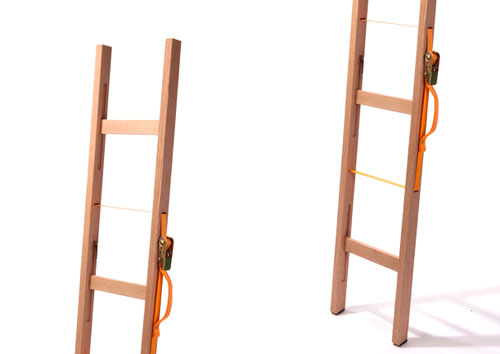 You always hear about designing a better mousetrap, but what about designing a better ladder? This ladder concept is actually cool, and looks like something you could whip up yourself. The thing uses one of those ratcheting motorcycle tie downs and a couple pieces of wood. When you need to carry the ladder somewhere or store it, the ladder comes apart easily.