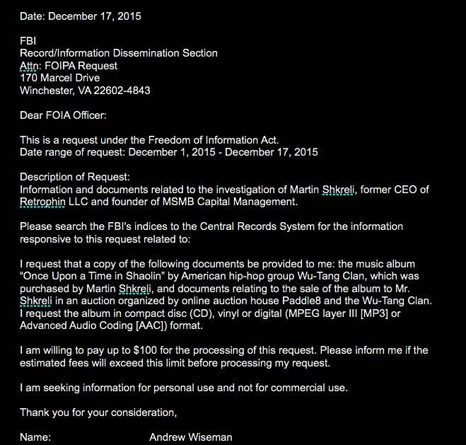 The Freedom of Information Act is a funny thing. Because of this act, everyday average citizens are able to send requests to the government to attain documents that, by all legal means and rights, aught to be public. As such, once the nefarious individual known as Martin Shkreli was arrested by the FBI earlier this week, geographer Andrew Wiseman sent a request to the FBI to release to him the Wu-Tang Clan album "Once Upon a Time in Shaolin." Why? Because Shkreli has it.NOTE: If it wasn't already abundantly clear, the above photo has been doctored by SlashGear. You can see the original in our first major breakdown of the sale of the Wu-Tang album.