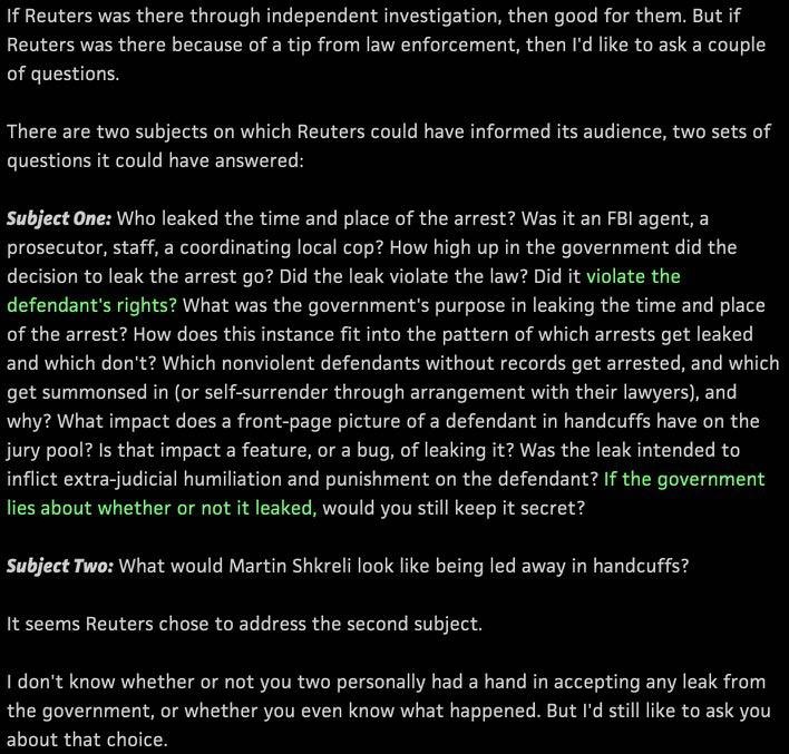 Apparently the photo of Shkreli being arrested, which you may or may not have seen, is part of another bit of controversy. Apparently, according Ken White of PopeHat, it's possible that the government agency responsible for arresting Shkreli likely tipped Reuters off to the arrest before it occurred.