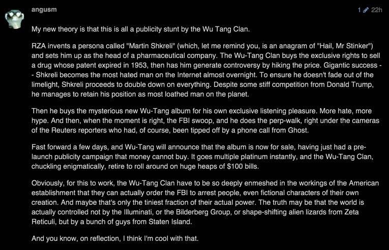And even that isn't the strangest piece of this odd epic. The real winner is the suggestion by a commenter on a BoingBoing story about the arrest photo. The rodent called Angusm says it was the Wu-Tang all along!