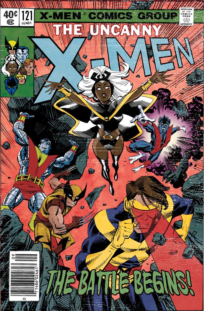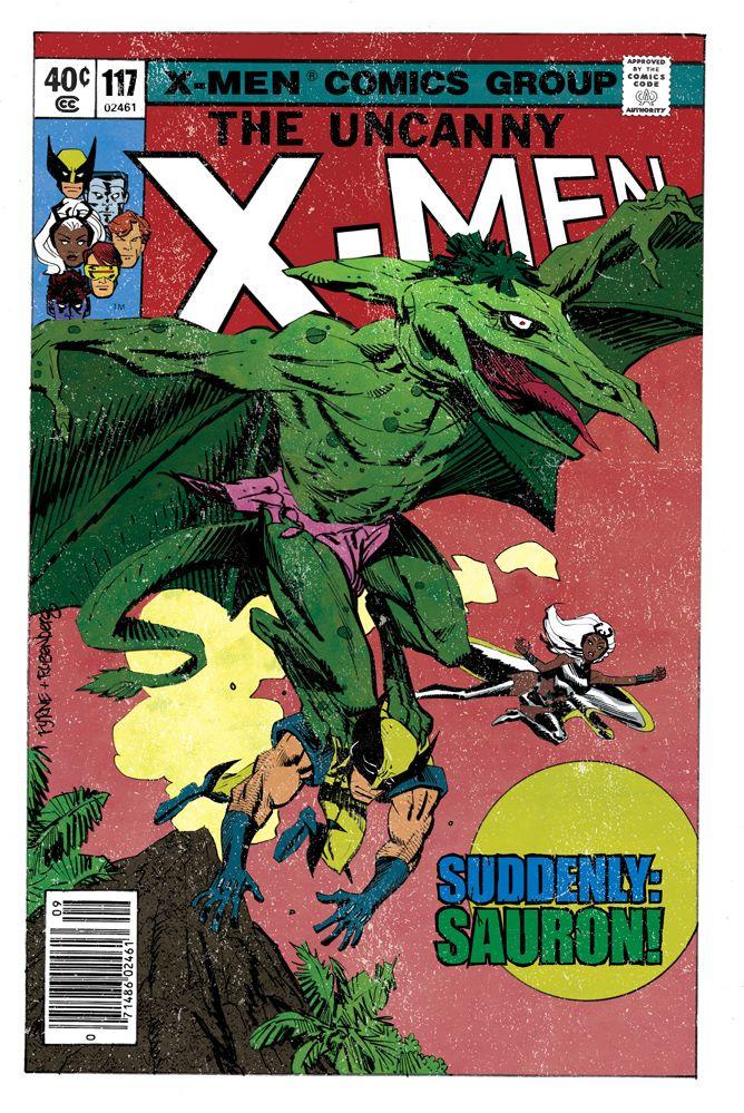 Below on the left is one iteration of the Uncanny X-Men cover for the story "Suddenly: Sauron!" This is the "cleaner" version, without quite so much distressing effects as the final version. On the right is the near-final version. The film version has a different Comics Code label and a new corner box illustration with just Banshee.