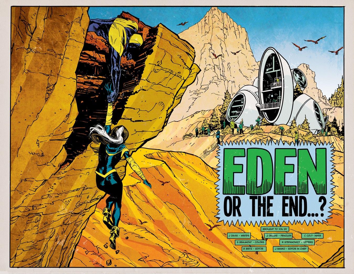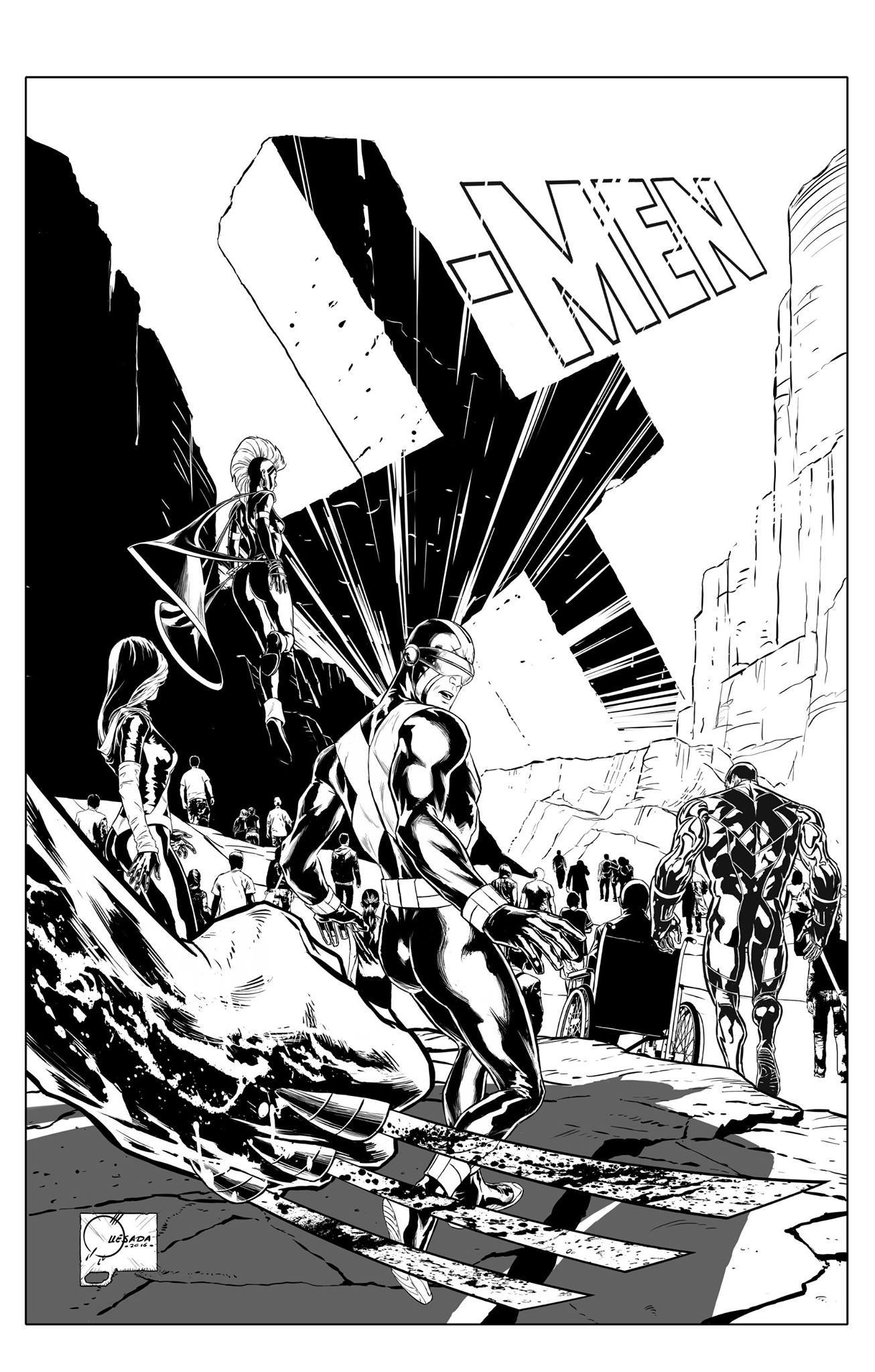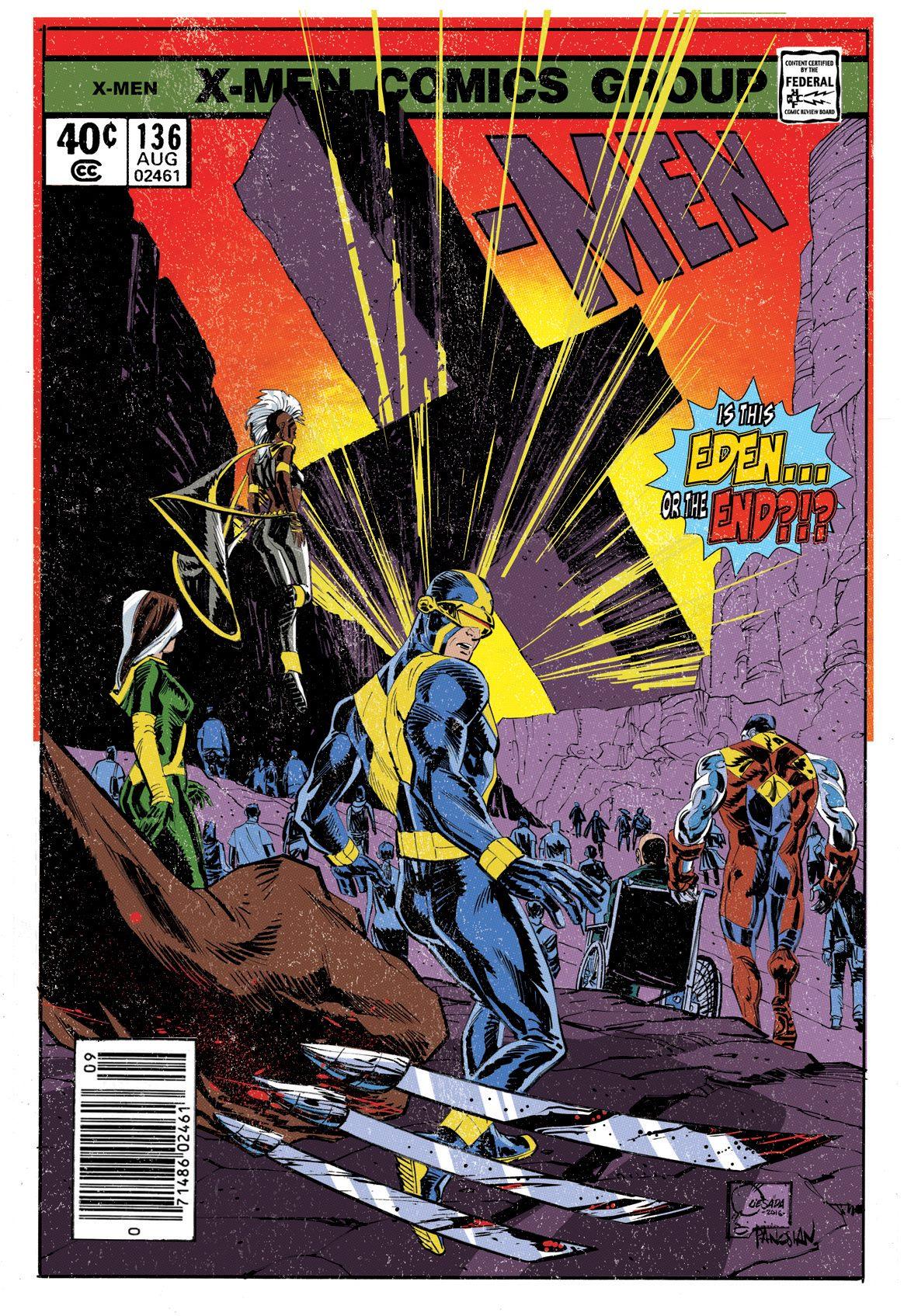 A couple of covers can be seen below. On the left is the X-Men cover for the Eden storyline by Quesada. On the right is the same cover colored and prepped with cover elements by Panosian. The Quesada signature has moved, Panosian's signature added, and an "Is this Eden... or the End?!?" call-out bit of text is added. The difference between the two with the washed-out coloring and breaking up of black spots with aging effects really makes the illustration go from modern to retro in an instant.