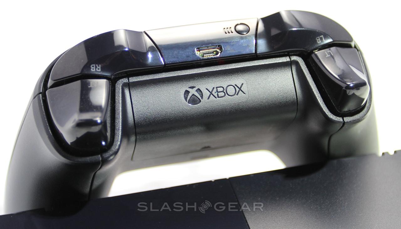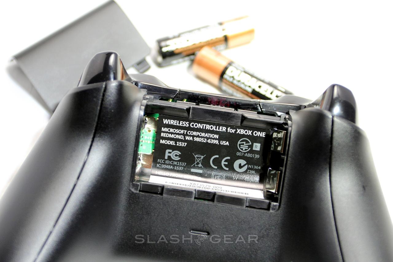 Around the edges you've got a bevy of ports for connections to power, Kinect, video, and accessories through the future. Along the left side of the device is a single USB 3.0 port for connecting accessories like the Xbox One Play & Charge Kit. This kit, mind you, replaces the two AA Duracell batteries that come with the controller in the box with the Xbox One. These batteries are otherwise non-rechargeable.