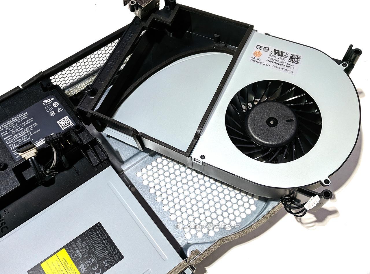A 120mm fan takes up a large portion of the inside of the case of the Xbox One X. This amalgamation of plastic and metal covers part of the heatsink (which, again, we'll talk about below). Another 1/4th of the internal space here is taken up by the Blu-ray disk drive – super simple, held in place by more T9 screws.