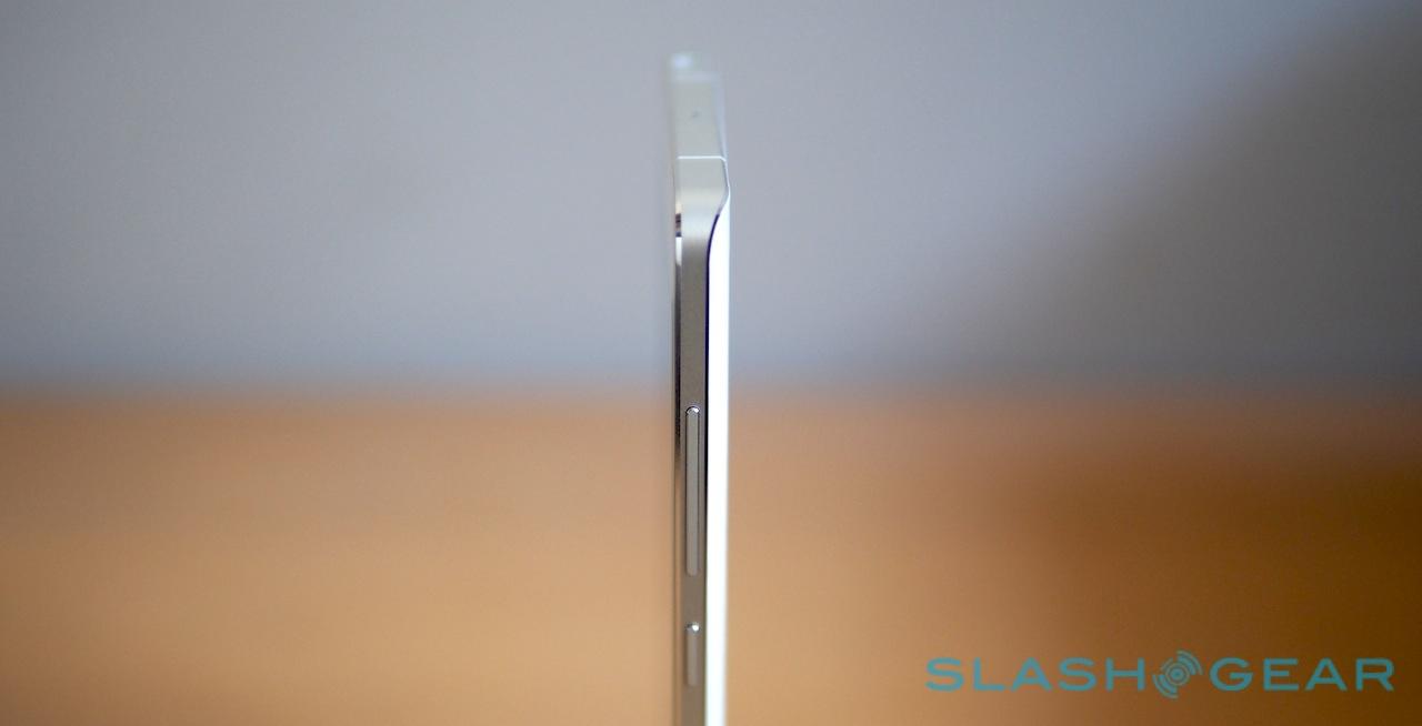 The spec overload doesn't stop there, either. The 5.7-inch display runs at 1080p resolution, and there's Qualcomm's Snapdragon 801 processor inside with 3GB of memory. A 13-megapixel camera using a Sony CMOS, color-mixing dual-LED flash, and optical image stabilization, all fitting flush into the chassis. On the flip-side, the front camera is "only" 4-megapixels but uses the same, 2-micron oversized pixels that HTC has made such a big deal about in its One M7 and M8 phones.