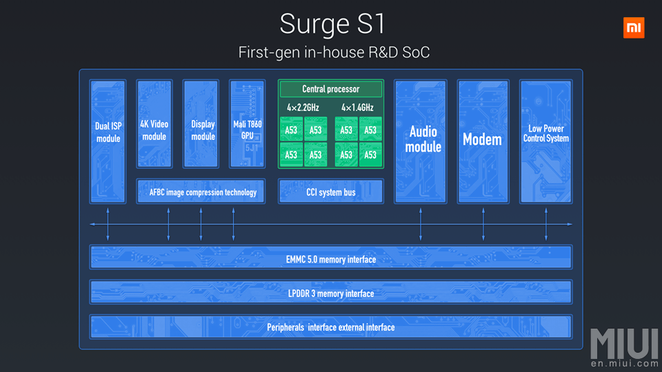 The Surge S1 is a 64-bit octa-core processor, made up of 8 Cortex-A53 cores clocked at 2.2 GHz and 1.4 GHz. Xiaomi is pitting its first ever in-house chip against the lower mid-range selection of other chip makers, like Qualcomm's Snapdragon 625 and both MediaTek's P20 as well as its P10. The Surge S1 is capable of handling dual image signal processors or ISPs, making it suitable for dual camera phones. The first Surge S1 phone, however, doesn't have that.