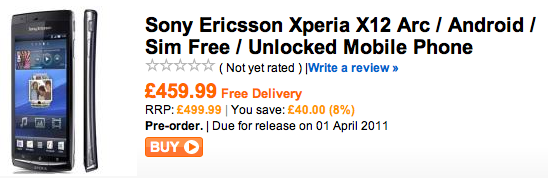 Sony Ericsson's gorgeous Xperia X12 Arc is now up for pre-order in the UK. You'll be paying £459.99 with free delivery if you live anywhere inside the United Kingdom, and that'll get you the unlocked phone with no SIM card so you'll be able to work with it on any carrier you choose. The site this phone is available on notes, again, the release date to be on the first of April, 2011. Can't wait!