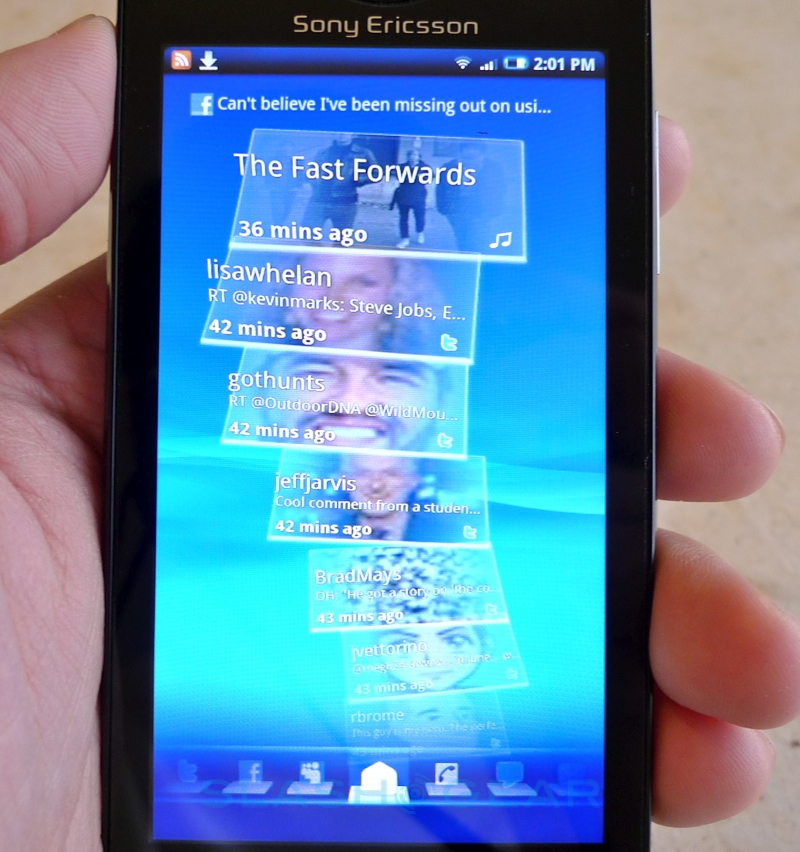 So, given you'll potentially be living with the stock X10 experience, how does it hold up? Aesthetically there's plenty to like, with various fluid transitions between menus, but the core offerings are Timescape and Mediascape. Timescape, like HTC "Friend Stream" and Motorola "Happenings", attempts to pull in all of your social life into one, chronologically ordered timeline; however where its rivals draw the line at online networks, Sony Ericsson have also included SMS, MMS and email messages, phone calls and other interactions. These are all presented in a cascade of cards which can be flicked up and down; tapping a card – say, a phone call from a friend – pulls up the full details (time of call, length, etc.) as well as the ability to view to that contact's full information including the full history of your contact with them.