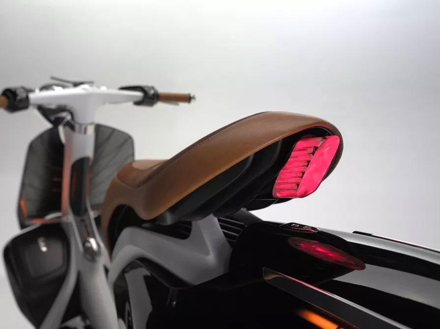Those transparent wing-like panels are actually the side panels for the scooter and they are designed to raise up to give access to the internal components. The transparent design also allows the internal structure of the scooter to be displayed. At its core, the 04Gen concept is a basic two-wheel scooter fancied up.