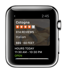 Yelp for Apple Watch does almost everything the standalone app does. You can find a place, see how far away from you it is, and even check out reviews and star ratings. And yes, you'll see their hours so you know when they're closing.