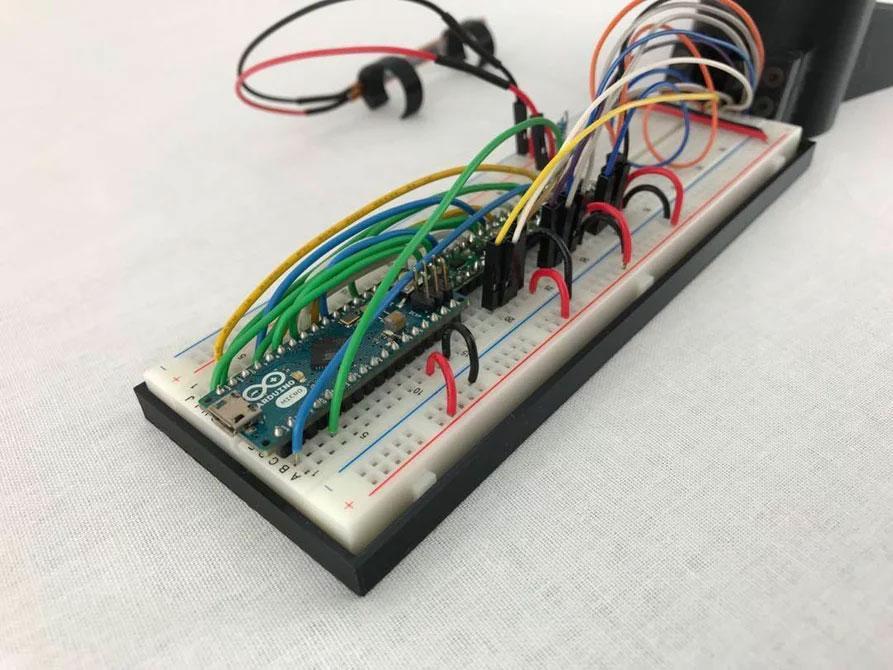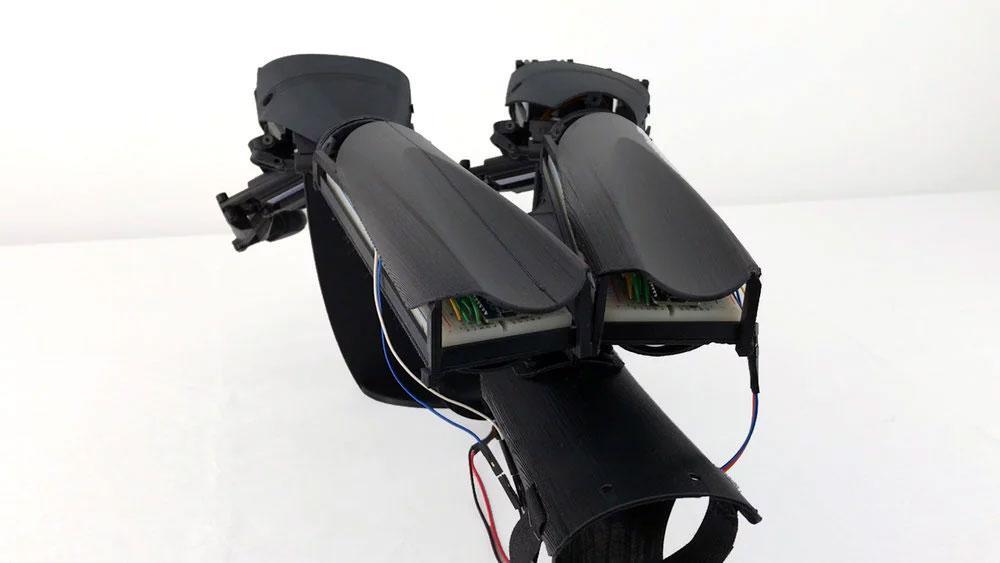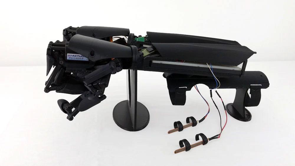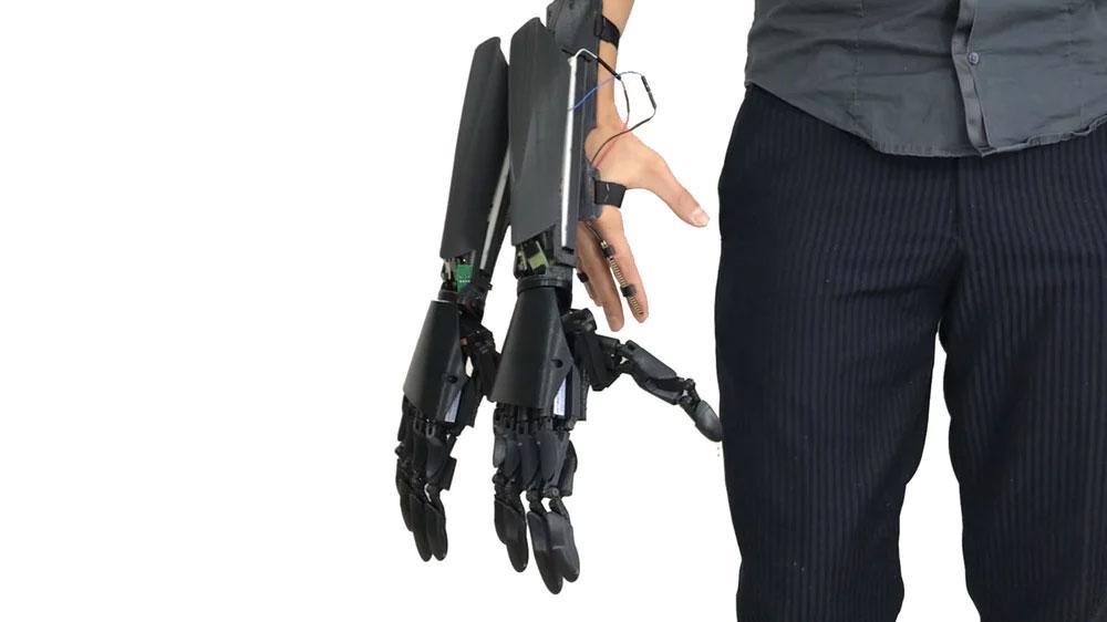 The double robotic hands are controlled in the same manner as the single hand from a few years back. There are flex sensors on the index and third fingers of the user's hands. They angle out in a V shape and each hand has six Actuonic actuators. Those actuators allow the robotic hands to open and close then a user moves their finger.