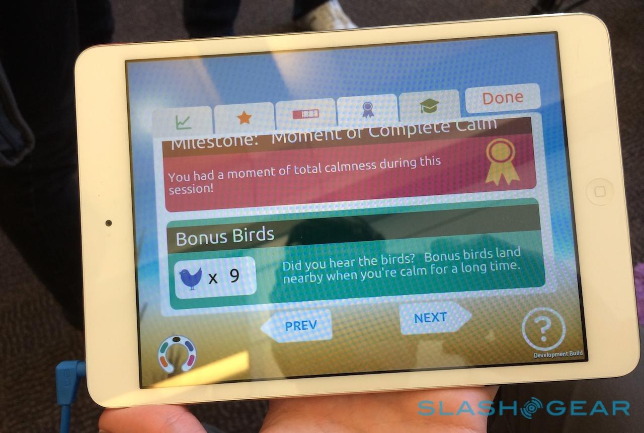 Muse uses auditory feedback to help keep you on track. Fully focused, and you hear the gentle lapping of waves. Get distracted, and you hear the wind instead. Moments of zen-style peace are rewarded by the chirping of birds. At the end, your calmness performance is totaled up as a numeric score, along with a graph of relaxed and distracted points, and a tally of how many periods of complete calm you achieved.
