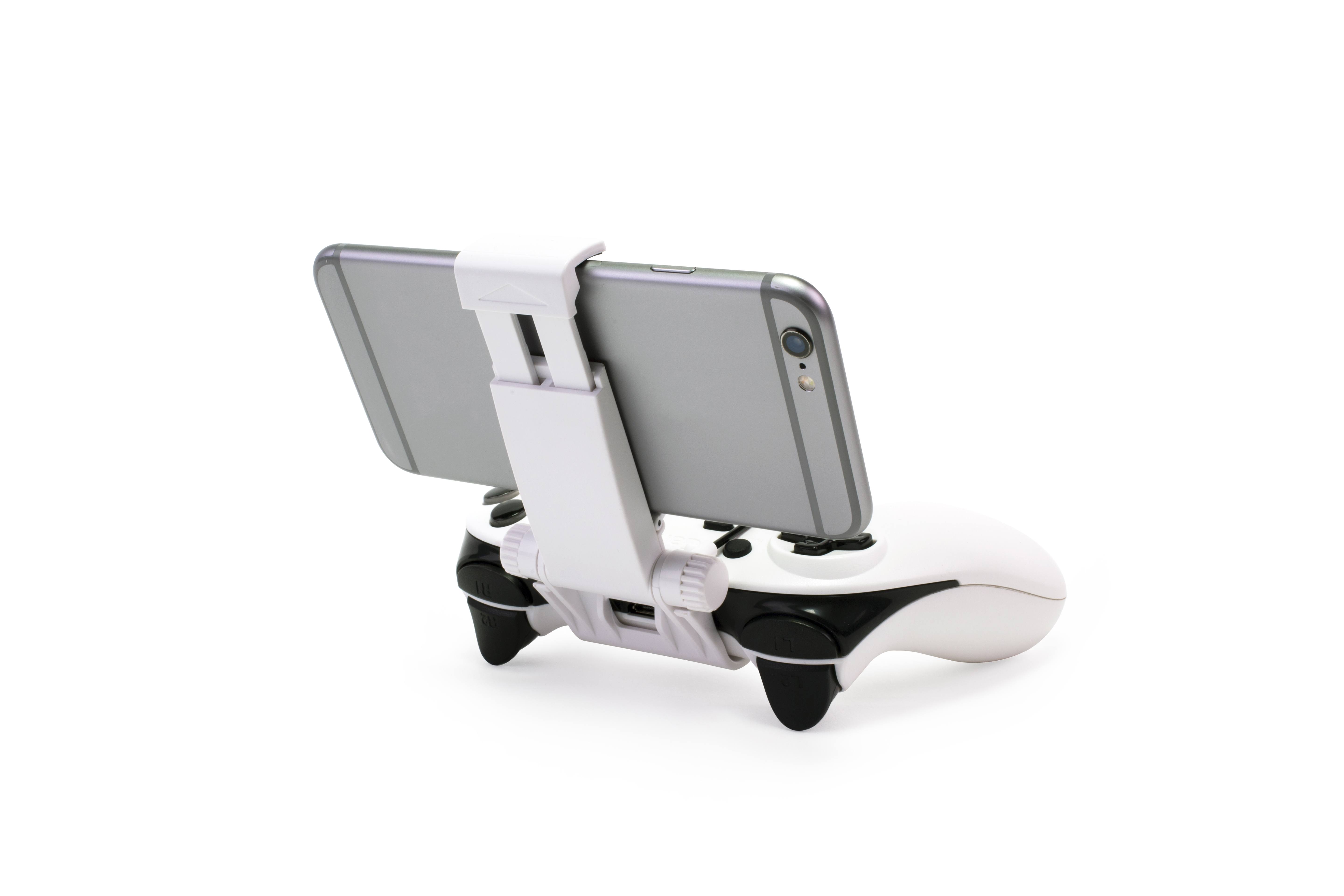 The controller connects to the smart device of the pilot via Bluetooth and allows the Breeze drone to be controlled with physical joysticks and buttons. It is compatible with the Breeze Cam mobile app for iOS and Android. The smart device is turned into a screen that is held by the handset for a first-person perspective from the Breeze onboard 4K camera.
