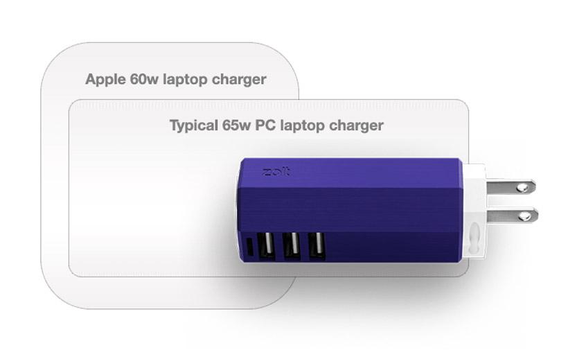 Zolt equips the charger with Efficient Resonant Control or ERCTM technology that automatically regulates power to each connected mobile device for fast charging and long battery life. It has three integrated USB ports and 90-degree rotatable prongs built-in.