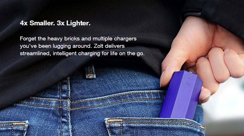 Zolt's charger produces 70W of power and is compatible with a number of popular brands of notebook computers on the market today. The charger claims to be four times smaller and three times lighter than current laptop chargers. It is three inches long and weighs three ounces making it easy to carry with you on the go.