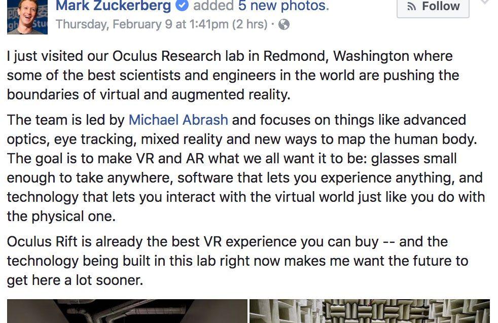Facebook CEO Mark Zuckerberg shared a series of photos from Oculus this afternoon, showing off a next-generation innovations well before release. This place goes by the name of Oculus Research and can be found in Redmond, Washington. This department is led by former Valve gaming head Michael Abrash and is responsible for handling such oddities as the VR-friendly gloves in the photo here with Zuckerberg slinging VR webs like Spider-Man.